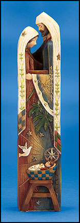 A rustic-styled Holy Family figure with the appearance of having been carved