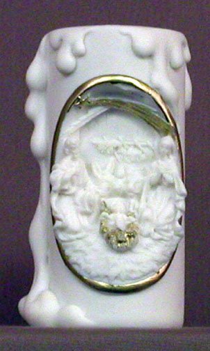 Nativity votive candle in white alabaster with gold highlights and comes with