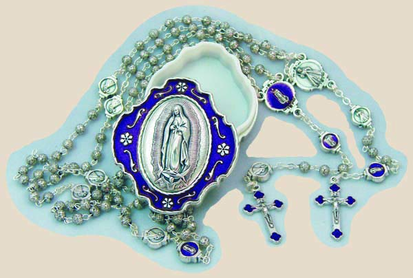 An Our Lady of Guadalupe blue enamel rosary box with a 14" long Divine
