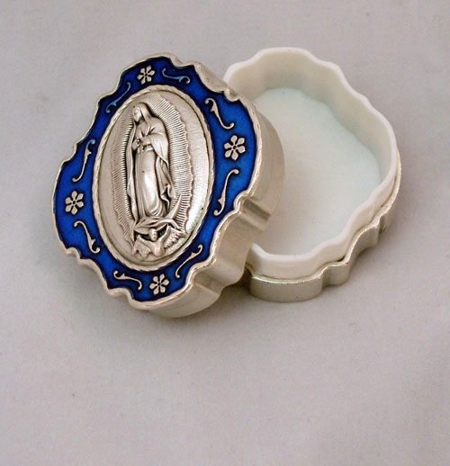 A beautifully crafted Our Lady of Guadalupe box, blue enamel, 1"x1 1/2"x1".