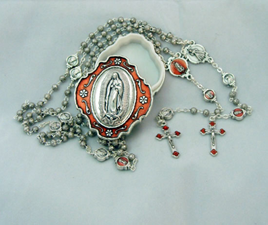 AL-42R-867 Guadalupe box in red enamel, 1"x1 1/2"x1" w/Guadalupe & Divine Mercy rosary, 14"