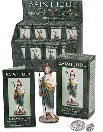 The Saint Jude Prayer Kit display includes 16 statues, each in individual