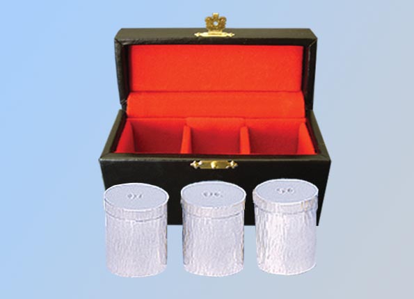 Silver-plated hand hammered high quality oil stocks in custom case.