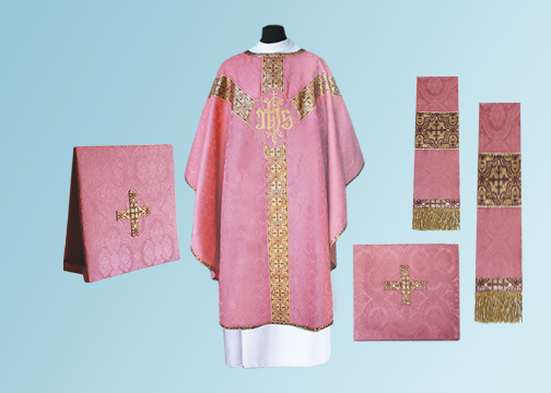 Gold metallic banding. Lined. Includes stole, maniple, burse and chalice veil.