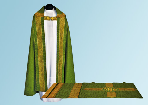 Exquisite damask fabric. Cope hoods with IHS embroidery and gold tassels. Lined. Includes stole. 60"L