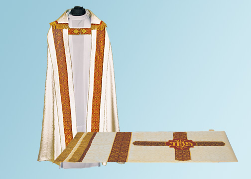 Exquisite damask fabric. Cope hoods with IHS embroidery and gold tassels. Lined. Includes stole. 60"L.