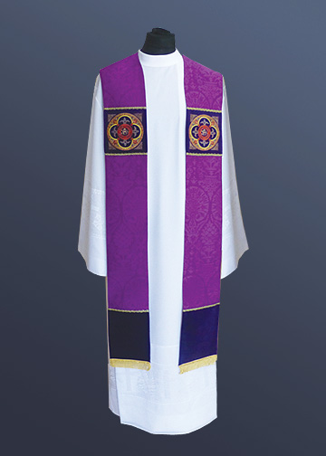 The Notre Dame Overlay Stole - rich Gothic inspired embroidery on front velvet panels, velvet bandings. Lined. 56"L. Purpl