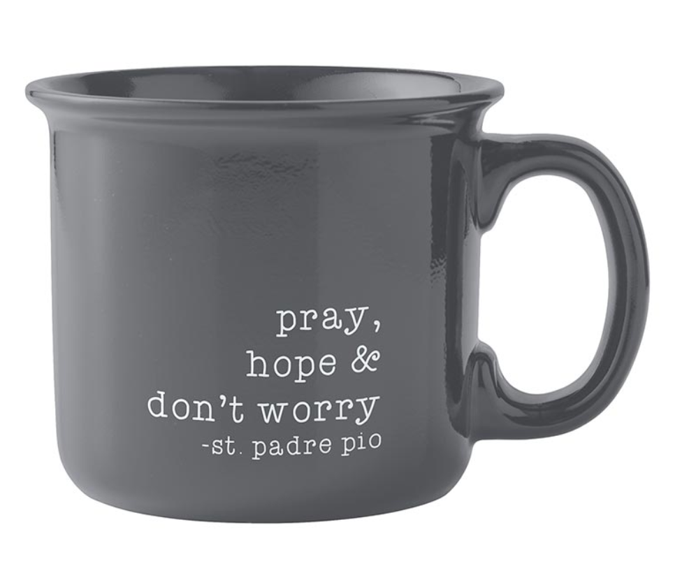 This coffee mug features a simple design with the phrase, "Pray, Hope & Don't Worry - St. Padre Pio." It holds 13 ounces and comes with a gift wrap sleeve, making it a great gift or give-away item for anyone!