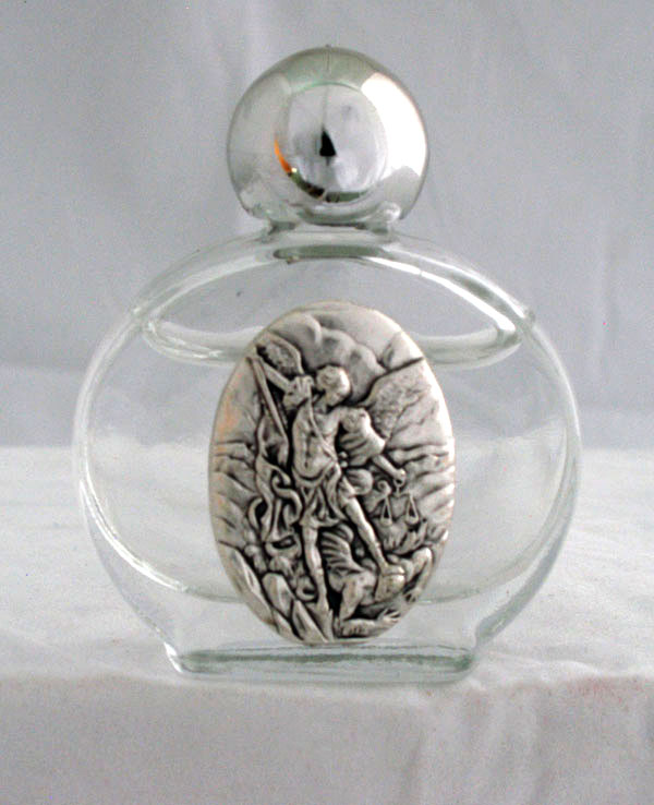 A beautiful holy water bottle with the image of St. Michael, finely crafted