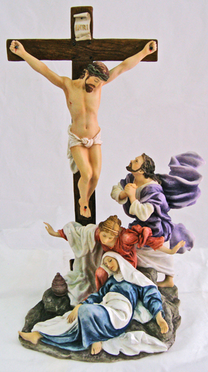 Crucifixion scene, hand-painted in full color, 11" tall"
