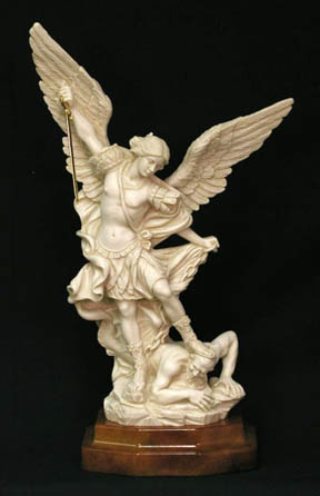 St. Miachel in antiqued alabaster with a brass sword on an alabaster base, 13.5".