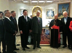 The premiere showing of “Dali’s Greatest Secret” included five princes, 3 princesses, and the Cardinal who designed the pope’s coat of arms. From left: Carlos Evaristo, secretary general to Portugal’s Duke of Braganza, Duke Diego of Spain, Duke Henrique of Portugal, Prince Joseph Habsburg of Austria, Prince Nicolas of Lichtenstein, Cardinal Montezemolo and Paul Perry. Dali’s painting takes center stage