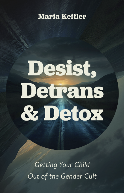 Desist, Detrans & Detox ISBN or UPC $21.95 ORDER HERE - ORDER INFORMATION In this actionable analysis of one of the most damaging movements of the modern age, renowned author Maria Keffler makes a compelling case that what lies at the core of the transgender phenomenon is a crisis of identity, and that only a loving but firm reality check can staunch the hysteria. Keffler makes unassailable arguments: Maleness and femaleness are immutable biological facts. Masculinity and femininity are personality constructs, conditioned by societal norms. But “gender,” the term favored by activists, has no solid definition. The language introduced by gender ideology is entirely subjective, which allows emotions to redefine reality. The very premise of the ideology is flawed and requires mental gymnastics of its adherents. Keffler outlines the disturbing parallels between cults and gender ideology: recruitment tactics that prey upon insecurities, indoctrination in nonsensical beliefs that must never be questioned, requirements to shun nonbelievers, and in-group newspeak which cultivates a sense of belonging. She exposes the cult of gender ideology with journalistic detail, digging into aspects the mainstream media chooses to ignore. She investigates: The origins of modern gender ideology in the 1960s |