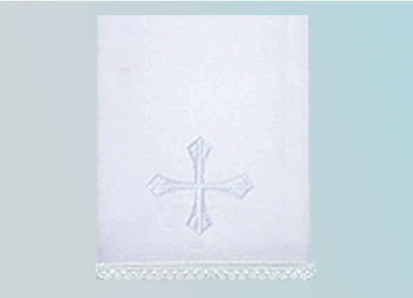 white on white cross embroidery, finished with lace. 100% Cotton. 17" x