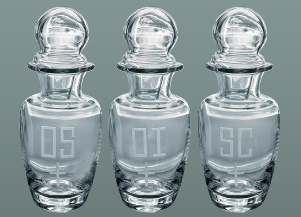 Glass Chrismatory set. Etched with the intitials OS, OI, SC. 8"Ht., 12 Oz. capacity. Sold in sets only.